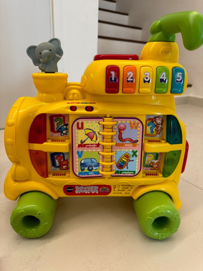 Vtech Ride On Train. 4-in-1 train, cart and activity panel takes kids from floor play to walker to ride-on to pull cart ; Removable panel enhances floor play with 10 learning buttons that teach numbers, colors and locations and encourages role-play driving ; 16 activities include 13 double-sided interactive alphabet blocks, travel book, turning gear and popping beads Push toy is designed to grow with your child; the toy train can be used as a floor toy, a ride on that also transforms into a baby walker or a pull toy wagon they can fill with toys ;